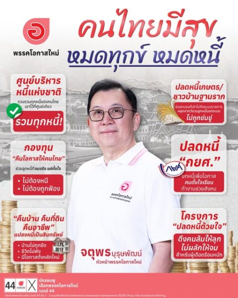 และพรรคโอกาสใหม่ ชูนโยบาย “คนไทยมีสุข หมดทุกข์ หมดหนี้”