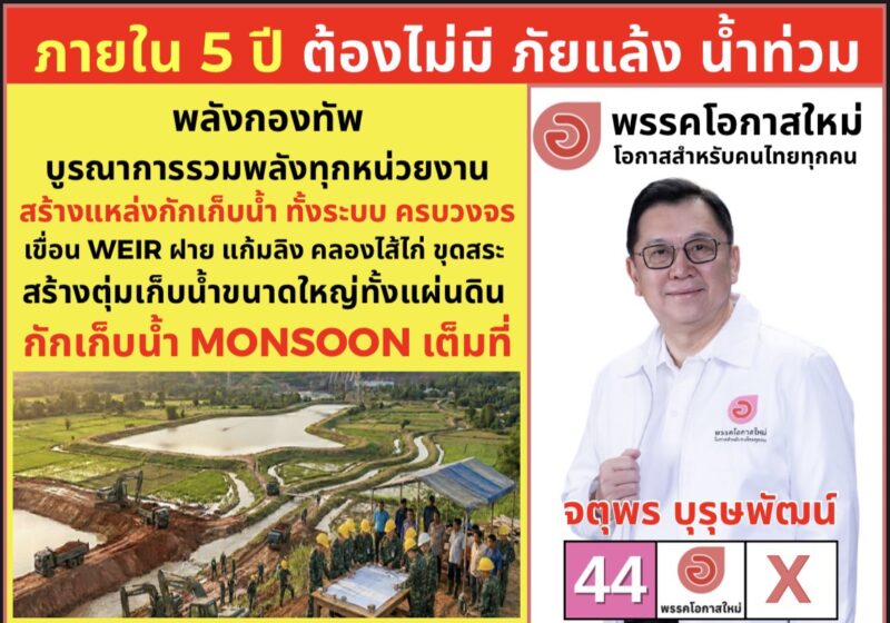 พรรคเน้นการเปลี่ยน “มรสุม” ให้เป็นโอกาส โดยมีเป้าหมายสูงสุดคือ “ภายใน 5 ปี ต้องไม่มีภัยแล้งและน้ำท่วม”