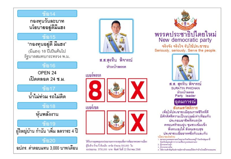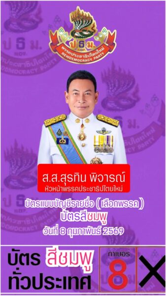 บรรยากาศบนถนนสู่การเลือกตั้งทั่วไปในวันที่ 8 กุมภาพันธ์ 2569 เริ่มระอุและทวีความคึกคักอย่างต่อเนื่อง ล่าสุด “พรรคประชาธิปไตยใหม่” ภายใต้การนำของ นายสุรทิน พิจารณ์ หัวหน้าพรรค เดินหน้าขยับทัพครั้งใหญ่ เปิดฉากแคมเปญรณรงค์หาเสียงเชิงรุก เน้นย้ำจดจำ “หมายเลข 8” สำหรับคะแนนในระบบบัญชีรายชื่อ (Party List) หรือ “บัตรสีชมพู”