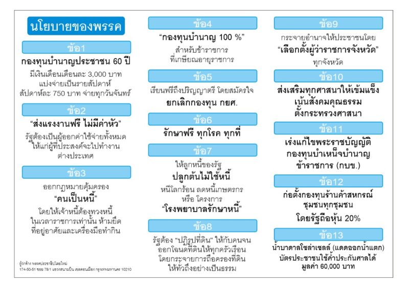 กองทุนบำนาญประชาชน 60 ปี: ข้อเสนอจ่ายเงินเดือนละ 3,000 บาท โดยปรับกลยุทธ์จ่ายเป็นรายสัปดาห์ (750 บาท ทุกวันจันทร์) เพื่อกระตุ้นเศรษฐกิจหมุนเวียนในชุมชน