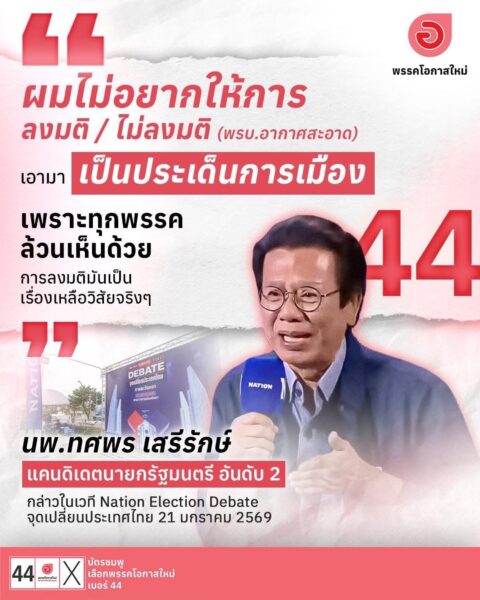 ในเวทีดีเบต “Nation Election DEBATE จุดเปลี่ยนประเทศไทย” พื้นที่ภาคตะวันออก นายแพทย์ทศพร เสรีรักษ์ แคนดิเดตนายกรัฐมนตรีอันดับ 2 ได้กล่าวถึงกรณีความเคลื่อนไหวเกี่ยวกับการพิจารณาพรรคร่างพระราชบัญญัติ (พ.ร.บ.) บริหารจัดการเพื่ออากาศสะอาด พ.ศ. …. โดยเน้นย้ำว่าไม่ควรนำกฎหมายฉบับนี้มาเป็นเครื่องมือในการโจมตีทางการเมือง