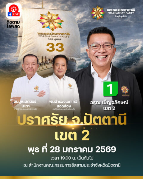 “พรรคประชาชาติ” รุกหนักพื้นที่เขต 2 ปัตตานี เปิดเวทีปราศรัยย่อย ณ สำนักงานคณะกรรมการอิสลามฯ “อรุณ เบ็ญจลักษณ์” ชูสโลแกน “เรือแห่งความหวัง” อ้อนขอคะแนนชาวบ้านโค้งสุดท้ายก่อนเลือกตั้ง 8 กุมภาพันธ์ ย้ำยุทธศาสตร์เลือกทั้งคนทั้งพรรค เบอร์ 33