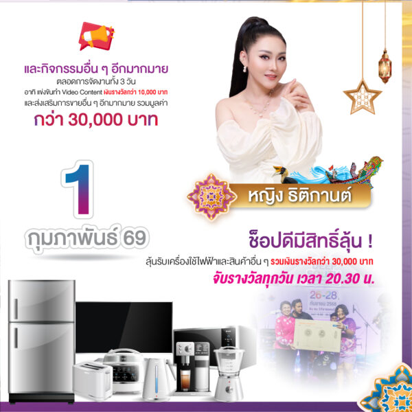 และยังมี กิจกรรมส่งเสริมการขาย แจกคูปองเงินสดและวงล้อลุ้นโชค รวมมูลค่ากว่า 30,000 บาท แคมเปญ “ช็อปดี มีคืน” ลุ้นรับเครื่องใช้ไฟฟ้าทุกวัน รวมถึง กิจกรรม TikTok Challenge และการแข่งขันกินเก่ง เพื่อสร้างสีสันในโลกออนไลน์