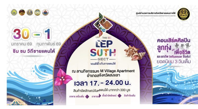 ในวันที่ 30 มกราคม 2569 ณ บริเวณลานกิจกรรม M VILLAGE HOSTEL อำเภอสะเดา จังหวัดสงขลา จะมีการเปิดงาน “มหกรรม Thai Deep South Connect ของดีพื้นที่ วิถีพื้นถิ่นชายแดนใต้” ครั้งที่ 5 อย่างเป็นทางการ ซึ่งถือเป็นกิจกรรมส่งท้ายของโครงการภายใต้ความร่วมมือระหว่าง ศูนย์อำนวยการบริหารจังหวัดชายแดนภาคใต้ (ศอ.บต.), กระทรวงพาณิชย์ และจังหวัดสงขลา
