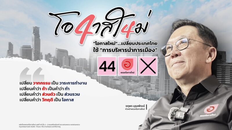 พรรคโอกาสใหม่ เปิดตัวแคมเปญหาเสียง เน้นการบริหารจัดการมากกว่าเกมการเมือง มุ่งเปลี่ยน ‘วาทกรรม’ เป็น ‘วาระงาน’ พร้อมชูเบอร์ 44 หวังเป็นทางเลือกใหม่ในสนามเลือกตั้ง