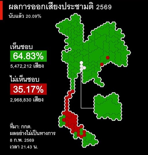 ความคืบหน้าการนับคะแนนการออกเสียงประชามติอย่างไม่เป็นทางการ ล่าสุดเมื่อเวลา 21.43 น. ของวันที่ 8 กุมภาพันธ์ 2569 ผลการนับคะแนนภาพรวมทั่วประเทศมีความคืบหน้าไปแล้วประมาณ 20.09%