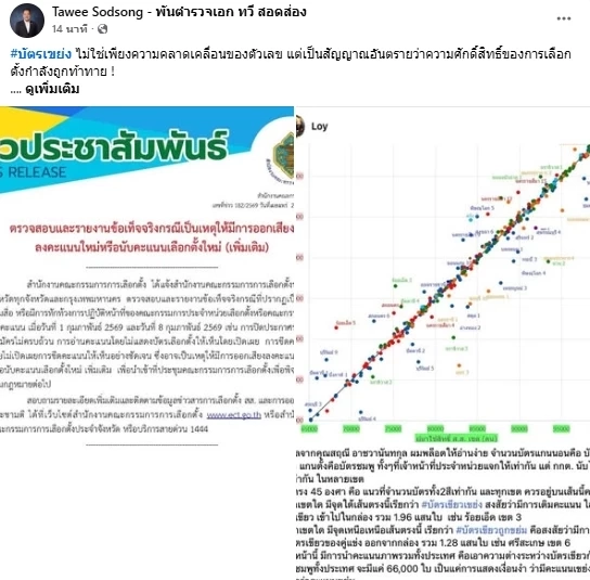 โดยภายหลังจาก “กกต.” เปิดผลการนับคะแนนเลือกตั้ง ส.ส. แบ่งเขตและบัญชีรายชื่อผ่านเว็บไซต์สำนักงาน กกต. ที่ชื่อ ‘ECT Report 69’ ในวันที่ 18 ก.พ.69 ต่อมามีนักวิชาการชื่อดังสองท่าน ทั้งอาจารย์สฤณี อาชวานันทกุล และอาจารย์ลอย ชูพงษ์ทอง นำข้อมูลมาวิเคราะห์เชิงสถิติ กระทั่งปรากฏข้อสังเกตสำคัญว่า มี #บัตรเขย่ง และ #บัตรขย่ม รวมกันสูงถึงประมาณ 324,000 ใบ !