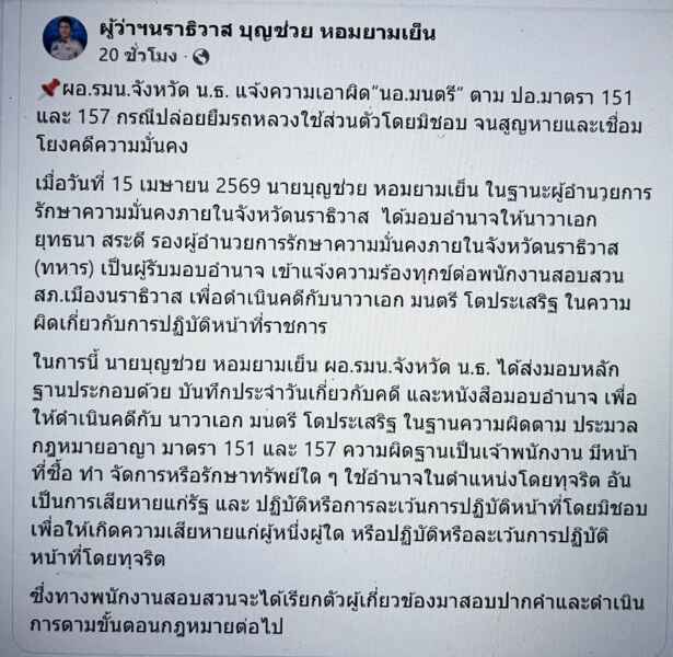 ความคืบหน้ากรณีการตรวจสอบการใช้งานทรัพย์สินทางราชการภายในกองอำนวยการรักษาความมั่นคงภายในจังหวัดนราธิวาส (กอ.รมน.จังหวัด น.ธ.) ล่าสุดมีรายงานว่า เมื่อวันที่ 15 เมษายน 2569 นายบุญช่วย หอมยามเย็น ผู้ว่าราชการจังหวัดนราธิวาส ในฐานะผู้อำนวยการรักษาความมั่นคงภายในจังหวัดนราธิวาส (ผอ.รมน.จังหวัด น.ธ.) ได้มอบอำนาจให้ นาวาเอก ยุทธนา สระดี รองผู้อำนวยการรักษาความมั่นคงภายในจังหวัดนราธิวาส (ฝ่ายทหาร) เดินทางไปยังสถานีตำรวจภูธรเมืองนราธิวาส เพื่อแจ้งความร้องทุกข์กล่าวโทษต่อพนักงานสอบสวน ให้ดำเนินคดีอาญากับ นาวาเอก มนตรี โตประเสริฐ
